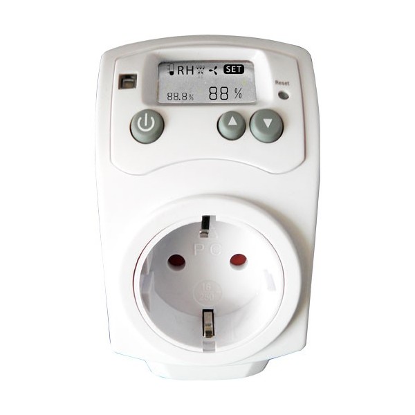 Permite controlar un extractor en función del grado de humedad relativa seleccionado. Dispone de dos funciones, modo control humidificador y modo control deshumidificador, y cualquiera de los dos dispositivos puede ser conectado al controlador. Es digital y visualiza la lectura de la humedad de la estancia, pudiendo ejercer un control eficaz del humidificador/deshumidificador que esté conectado en ese momento.