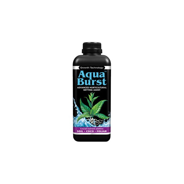 AquaBurst de Growth Technology es un humectante concentrado para cultivos que ayuda a los medios sólidos como el coco y la tierra a retener líquidos, evitando el encharcamiento irregular del sustrato y la creación de zonas secas, que son un peligro para las raíces de las plantas. Se trata de un aditivo que reduce la tensión superficial del agua, permitiendo que ésta penetre más lentamente y de manera más homogénea.