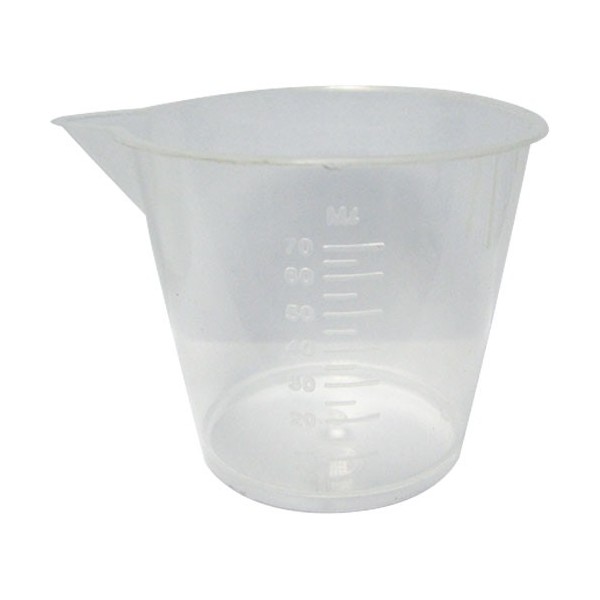 Vasos de plastico graduado para poder medir cantidades líquidas, disponibles en 70 y 250 mililitros.