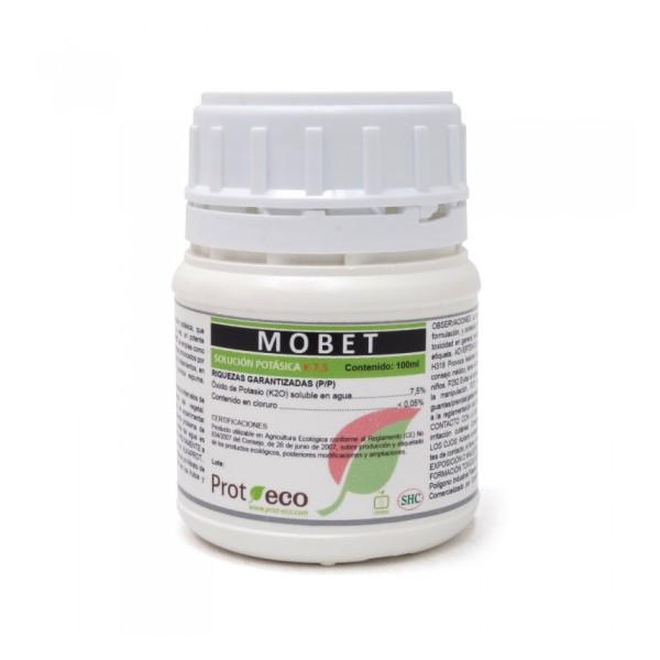 Mobet es un producto natural, ecológico y biodegradable. Es una solución potásica, que constituye una fuente nutricional de potasio para los cultivos. Tiene a su vez, un potente efecto anti-deshidratante cuando la temperatura es elevada.