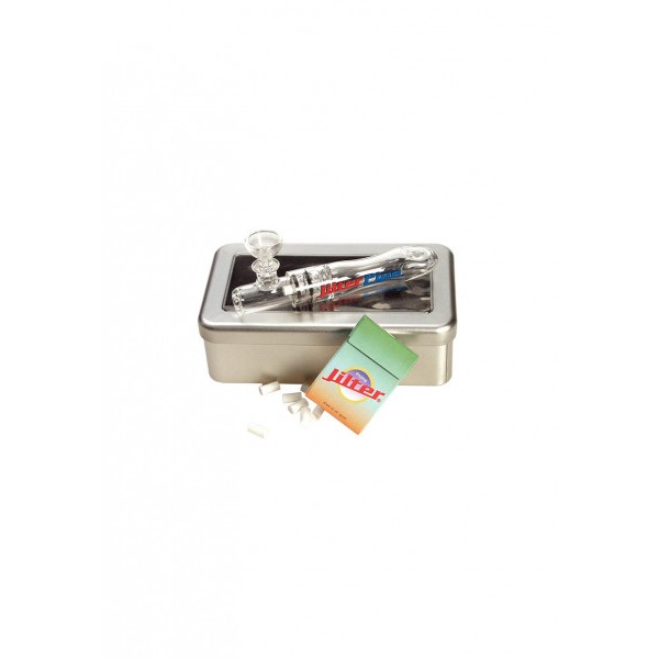La Pipa Jilter es un dispositivo manual hecho de vidrio borosilicatado y se usa con filtros Jilter. La pipa viene con un estuche protector de metal. Los filtros Jilter están diseñados para reducir alquitrán, nicotina y otros agentes nocivos y cancerígenos. Esta pipa transparente solo mide 13cm, pero el bol es muy grande para una pipa tan pequeña. Incluye un paquete de filtros Jilter.