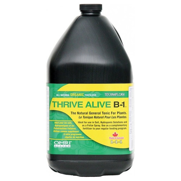 Thrive Alive B-1™ es un poderoso tónico preventivo y restaurador de uso general para plantas que promueve el crecimiento vegetativo rápido y exuberante. Asegura el éxito de cosechas florales a través de la promoción de la floración profusa dura nte el florecimiento. Su fórmula profesionalmente balanceada contiene vitaminas y nutrientes que se encuentran en algas pardas marinas de primera calidad de Columbia Británica. De alta concentración, Thrive Alive B-1™ es seguro y fácil de usar, tanto en aplicaciones hidropónicas o de suelos.