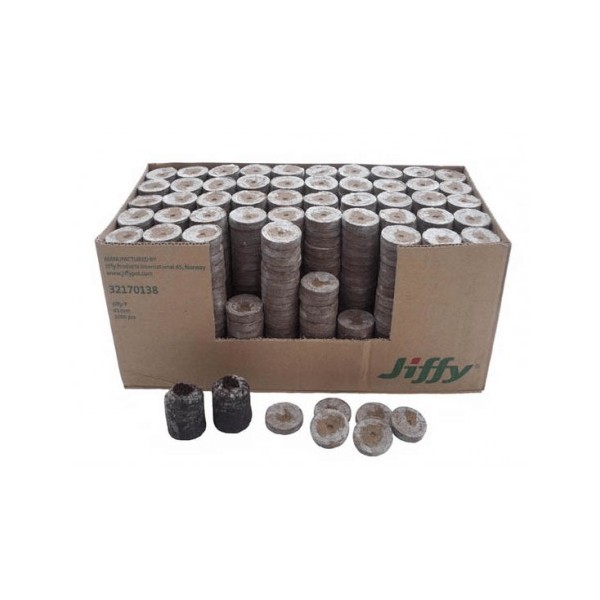 Cajas completas de Jiffy 7. El Jiffy 7 es una pastilla de turba prensada para siembra y para esquejes. Existen 4 diámetros de pastilla distintos: 44, 41, 33 y 24 milímetros. Las medidas indicadas del diámetro de la pastilla Jiffy son en su estado hidratado. Las correspondencias son: